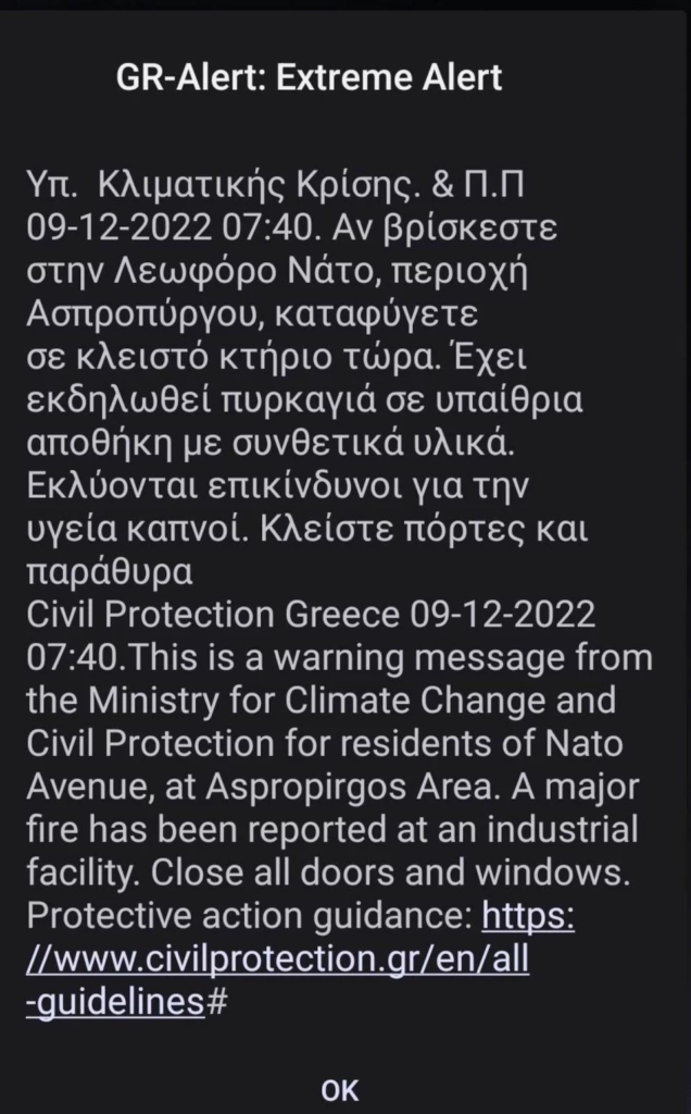 «Καταφύγετε σε κλειστό κτίριο τώρα. Έχει εκδηλωθεί πυρκαγιά σε υπαίθρια αποθήκη με συνθετικά υλικά. Εκλύονται επικίνδυνοι για την υγεία καπνοί. Κλείστε πόρτες και παράθυρα», αναφέρεται στο μήνυμα από το 112.