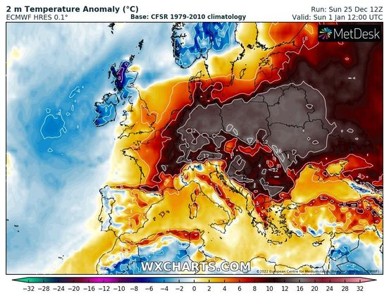 «Σύμφωνα και με τελευταία στοιχεία του Ευρωπαϊκού Μοντέλου ECMWF αλλά και των υπολοιπων παγκόσμιων προγνωστικών μοντέλων, το σύνολο των χωρών της Ευρώπης βαδίζει τις επόμενες ημέρες σε μια νέα θερμή εισβολή, η οποία και θα αποτελειώσει σταδιακά την όποια εναπομείνασα χιονοκάλυψη ακόμα και κοντά στα 2000 μέτρα στα περισσότερα χιονοδρομικά της! Για τις περισσότερες χώρες της γηραιάς ηπείρου θα πρόκειται λοιπόν, κατά πάσα πιθανότητα για τη θερμότερη έναρξη ενός νέου έτους που έχει καταγραφεί ποτέ στη μετεο ιστορία της! Μια αλλαγή στην όλη αυτή κατάσταση και εναρμόνιση του καιρού με το ημερολόγιο “ψιθυρίζουν” κάποια μακροπρόθεσμα στοιχεία για το σύνολο της Ευρώπης συμπεριλαμβανομένης και της χώρας μας για μετά τις 11-13 του Γενάρη» σημειώνει ο μετεωορολόγος της ΕΡΤ στην ανάρτησή του.