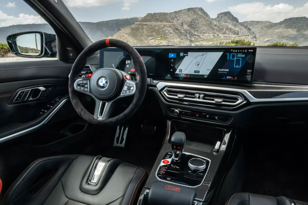 H εικόνα στο εσωτερικό είναι εξίσου σκληροπυρηνική με τα μπάκετ καθίσματα και το νέο Curved ταμπλό (η M4 CSL έχει το παλιό πίνακα οργάνων), ενώ δεν λείπει η περίσσεια επενδύσεων από αλκαντάρα/ κάρμπον και τα φωτιζόμενο CS λογότυπα.