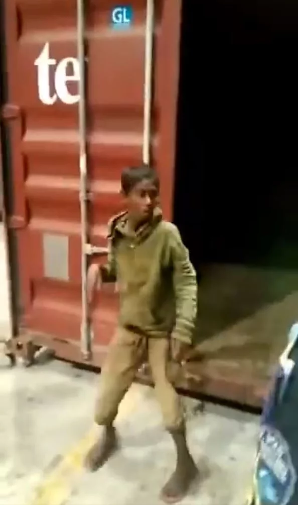 Φωτογραφίες και βίντεο που τραβήχτηκαν από τους εργαζόμενους στο Port Klang δείχνουν το αγόρι να είναι σε σύγχυση από το άγνωστο περιβάλλον καθώς βγαίνει από το κοντέινερ.