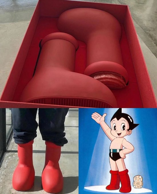 Παρουσιάστηκαν πρόσφατα από την καλλιτεχνική κολεκτίβα MSCHF με έδρα τη Νέα Υόρκη, με το δελτίο τύπου της εταιρείας να τις περιγράφει ως «μπότες κινουμένων σχεδίων για έναν φρέσκο τρισδιάστατο κόσμο». Πάντως όπως παρατήρησαν πολλοί, οι γιγαντιαίες μπότες από καουτσούκ μοιάζουν τρομερά με αυτές που φορούσε ο ιαπωνικός χαρακτήρας manga Astro Boy.