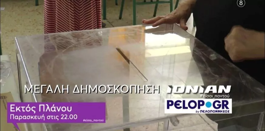 Τα αποτελέσματα της μεγάλης δημοσκόπησης της εφημερίδας «Πελοπόννησος» για τις επερχόμενες εκλογές στην Περιφέρεια Δυτικής Ελλάδος θα παρουσιαστούν σήμερα, Παρασκευή 7 Απριλίου, στην την εκπομπή «Εκτός Πλάνου» στο ΙΟΝΙΑΝ TV στις 10 το βράδυ με τον Τάσο Θεοδόση.