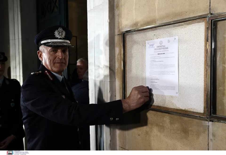Το Προεδρικό Διάταγμα για τη διάλυση της Βουλής θυροκόλλησε στην ανατολική είσοδο του Μεγάρου, περί τις 20:10, ο φρούραρχος της Βουλής, ταξίαρχος Φώτης Ντουίτσης.