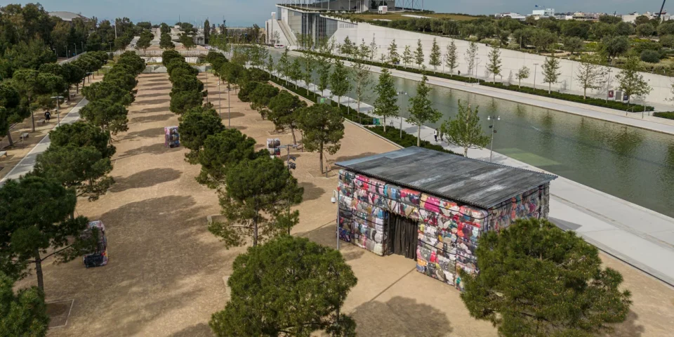 Τώρα το ΚΠΙΣΝ συνεργάστηκε με το ΕΜΣΤ και έφεραν στο χώρο, σε επιμέλεια Κατερίνας Γρέγου το έργο «Return to Sender» της κολεκτίβας ΝΕST από την Κένυα. 150 δεμάτια με σχολαστικά συσκευασμένα και πιεσμένα ρούχα που ο τελικός προορισμός τους είναι η ανακύκλωση. Κάθε ένα δεμάτι ζυγίζει 270 κιλά. Σχηματίζουν κάτι σαν σπίτι, έναν οίκο βάρους 40 τόνων και ύψους 4.60 μέτρων. Ένα σχόλιο της υποκρισίας της φιλανθρωπίας που χαρακτηρίζει τον σύγχρονο άνθρωπο -ξεφορτώνεται παλιά ρούχα, φθαρμένα και τα στέλνει σε χώρες της Αφρικής. Μόνο που είναι τόσο παλιά, τόσο κατεστραμμένα, τόσο βρώμικα που τελικά καταλήγουν σε ειδικές χωματερές. Και έτσι οι χώρες της Αφρικής επιβαρύνονται με επιπλέον κόστος για να τα καταστρέψουν.