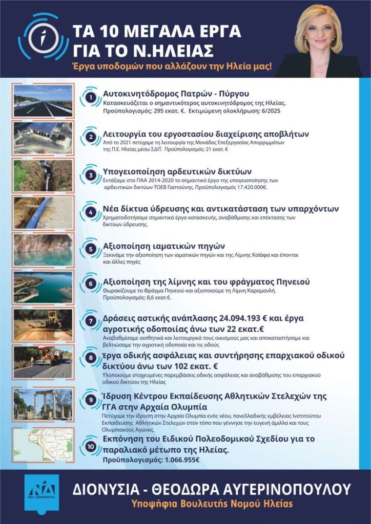 Στην Ηλεία, στην πρώτη τετραετία της Κυβέρνησης της Νέας Δημοκρατίας, έχουμε δει μεγάλα έργα, όπως η κατασκευή της Ολυμπίας Οδού ως προς το τμήμα «Πάτρα – Πύργος» να μπαίνουν στο δρόμο της υλοποίησης. Δρομολογήθηκαν δε δημόσια και ιδιωτικά αναπτυξιακά έργα, όπως η αξιοποίηση των ιαματικών πηγών του Καϊάφα και η θωράκιση και αξιοποίηση της Λίμνης και του Φράγματος Πηνειού, τα οποία θα φέρουν νέες και πρόσθετες θέσεις εργασίας και εισοδήματα για το Νομό, αλλά και πολλαπλά περιβαλλοντικά οφέλη.