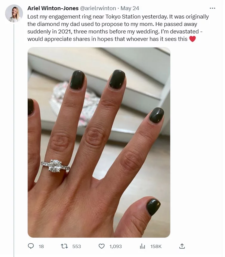 Αργότερα εκείνη την ημέρα η Winton-Jones έκανε δημόσια έκκληση στο TikTok και στο Twitter ρωτώντας -προφανώς χωρίς να τρέφει ελπίδες- αν κάποιος στο Τόκιο είχε δει το δαχτυλίδι.