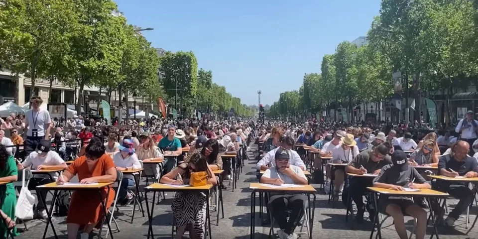 Κάτω από έναν λαμπρό ήλιο τοποθετήθηκαν από 1.779 θρανία στη λεωφόρο του Παρισιού για κάθε γύρο καθώς οι διοργανωτές προσπαθούσαν και κατάφεραν να σπάσουν το παγκόσμιο ρεκόρ για μαζικό διαγωνισμό ορθογραφίας.