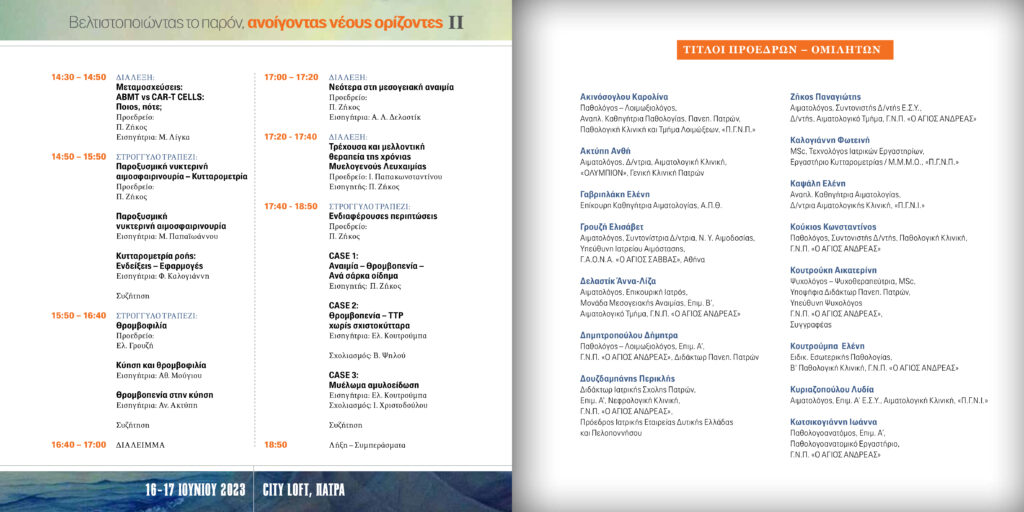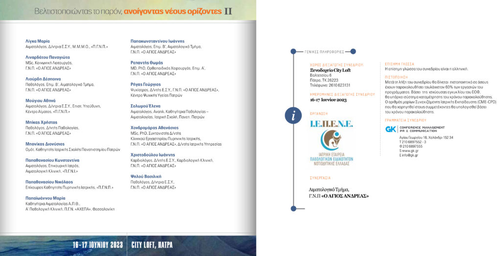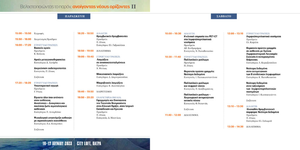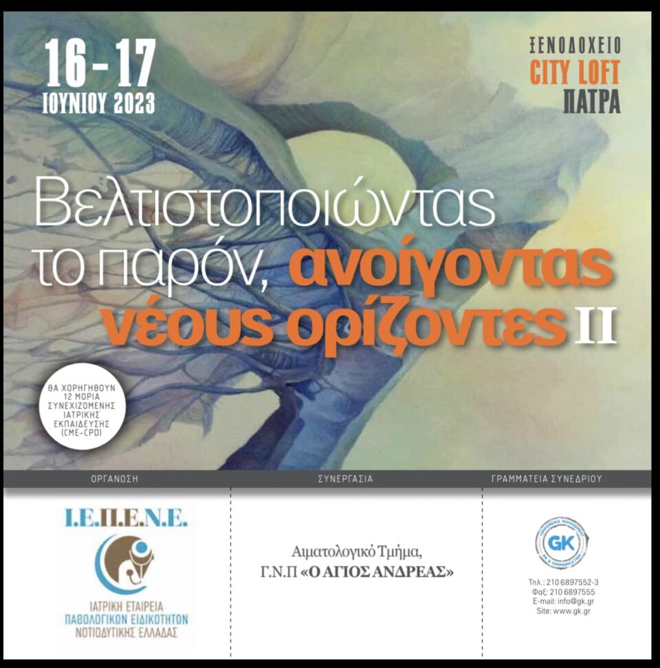 “Αγαπητοί συνάδελφοι και φίλοι, το Αιματολογικό Τμήμα του Γενικού Νοσοκομείου Πατρών “ΑΓΙΟΣ ΑΝΔΡΕΑΣ”, σε συνεργασία με την ΙΑΤΡΙΚΗ ΕΤΑΙΡΕΙΑ ΠΑΘΟΛΟΓΙΚΩΝ ΕΙΔΙΚΟΤΗΤΩΝ ΔΥΤΙΚΗΣ ΕΛΛΑΔΑΣ, διοργανώνει διημερίδα στις 16-17 Ιουνίου, στην Πάτρα. Με στόχο την ενημέρωση και την ανταλλαγή γνώσεων και απόψεων στις σύγχρονες εξελίξεις σε καλοήθη και κακοήθη αιματολογικά νοσήματα. Προσκεκλημένος ομιλητής ο ομότιμος καθηγητής του Πανεπιστημίου Πατρών Διονύσης Μπονίκος, δάσκαλος πολλών από μας, μέντορας αρκετών από μας, ο οποίος θα δώσει διάλεξη με θέμα: “Εφαρμογές και Επιπτώσεις της Τεχνητής Νοημοσύνης, στην Κλινική Πράξη, την Ιατρική Εκπαίδευση και Έρευνα”. Η παρουσία σας θα είναι τιμή για μένα και για το αιματολογικό τμήμα”.