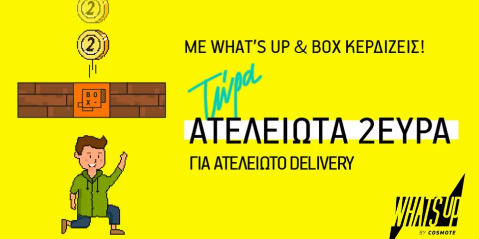 Mε χιλιάδεςκαταστήματα σε όλη την Ελλάδα,όπως μεγάλες αλυσίδες εστίασης, δημοφιλή brands και τοπικές επιχειρήσεις,οι χρήστες του WHAT’S UP θα βρουν στο BOX, την υπηρεσία online παραγγελίας φαγητού της COSMOTE, μια μεγάλη ποικιλία σε γεύσεις και κουζίνες για να παραγγείλουν αυτό που επιθυμούν. Η πλατφόρμα του ΒΟΧ εμπλουτίζεται συνεχώς με νέες περιοχές και νέες κατηγορίες προϊόντων. Παράλληλα, οι χρήστες του WHAT’S UP σε κάθε παραγγελία στο ΒΟΧ επωφελούνται διπλά: μπορούν να χρησιμοποιήσουν και την έκπτωση των 2€ και να κερδίζουν πόντους και GB στις παραγγελίες τους.