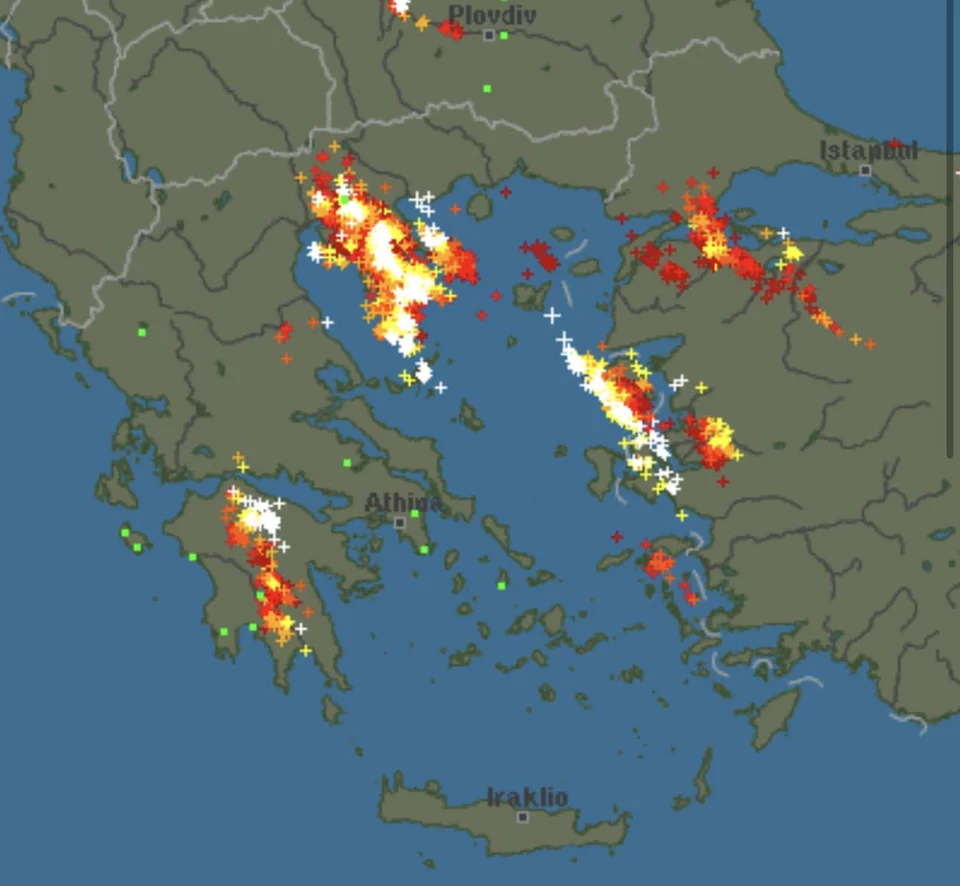 Επίσης ισχυρές καταιγίδες σημειώνονται στη Χαλκιδική και τοπικά έντονες στις Σποράδες και στα ορεινά της Πελοποννήσου αυτή την ώρα σύμφωνα με το weather forecast.