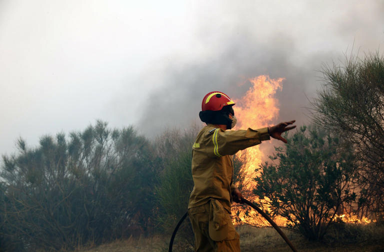 Η φωτιά καίει δασική έκταση, σύμφωνα με την Πυροσβεστική.