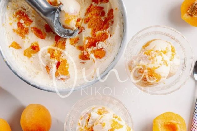 - Ξαναβγάζω το παγωτό, το χτυπάω και πάλι με το μίξερ και προσθέτω τα βερίκοκα. Ανακατεύω απαλά να σκορπίσουν και βάζω και πάλι στην κατάψυξη για 6 ώρες.