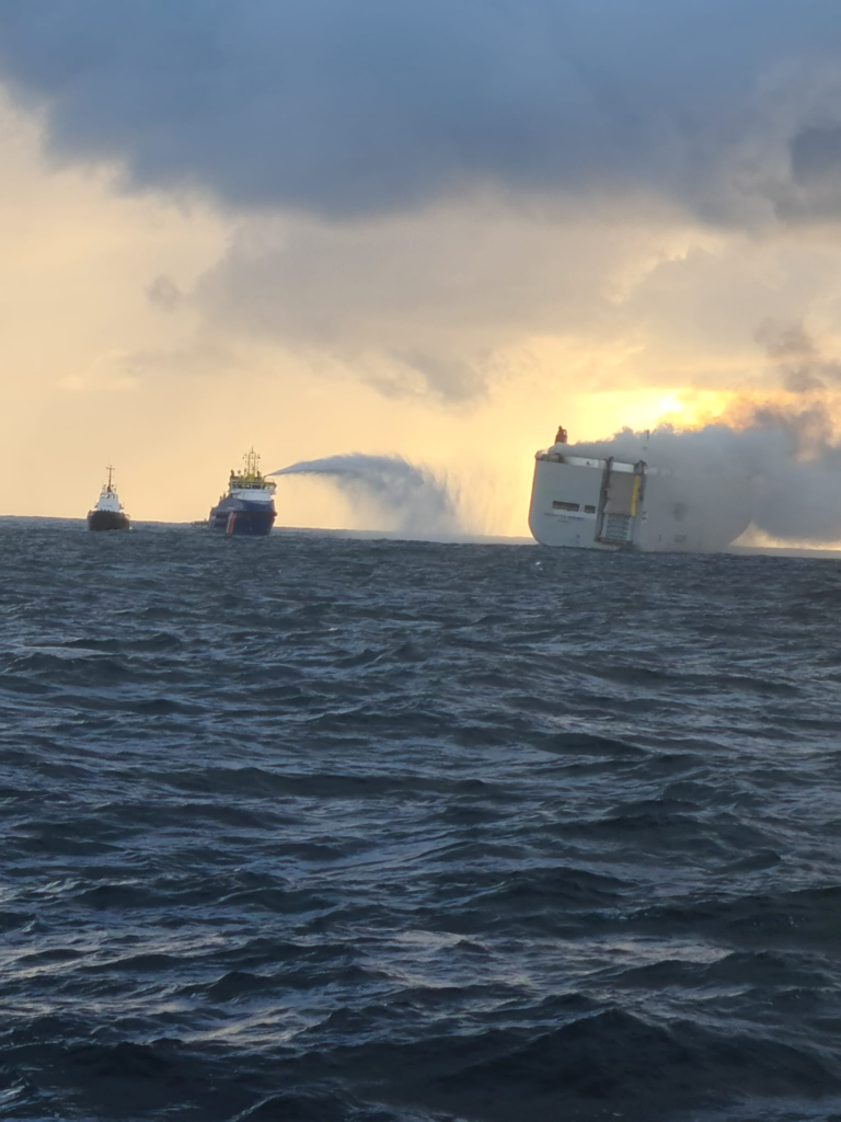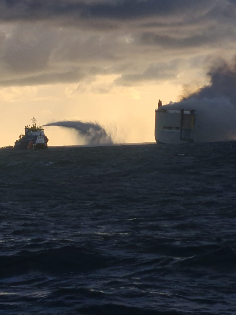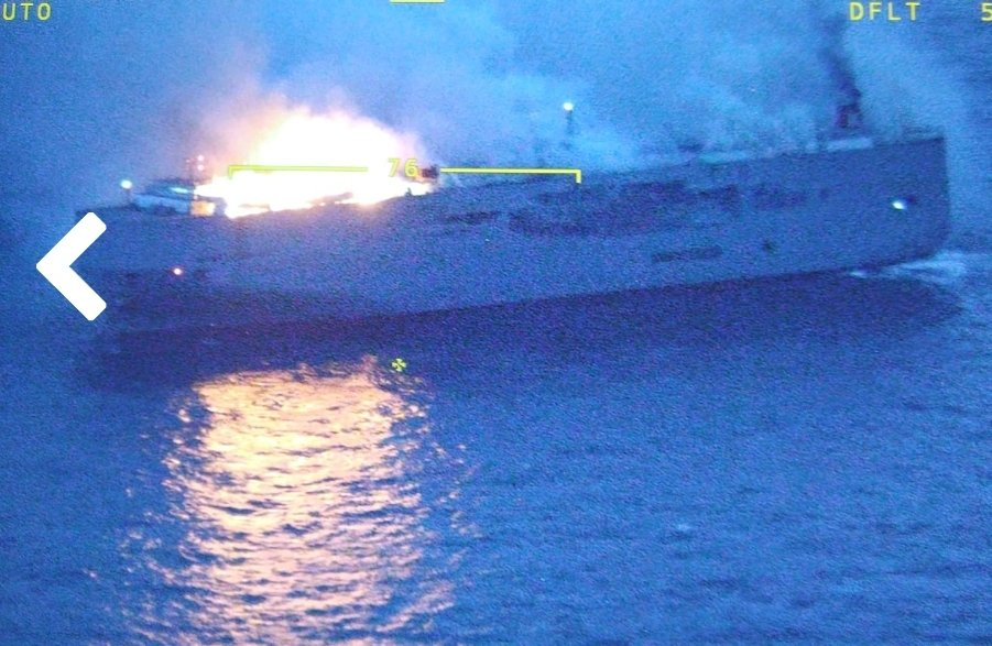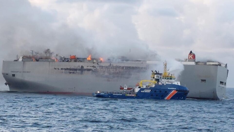 Στον βυθό της θάλασσας κινδυνεύουν να βρεθούν περίπου 3.000 αυτοκίνητα που βρίσκονται σε πλοίο που έχει τυλιχθεί στις φλόγες.