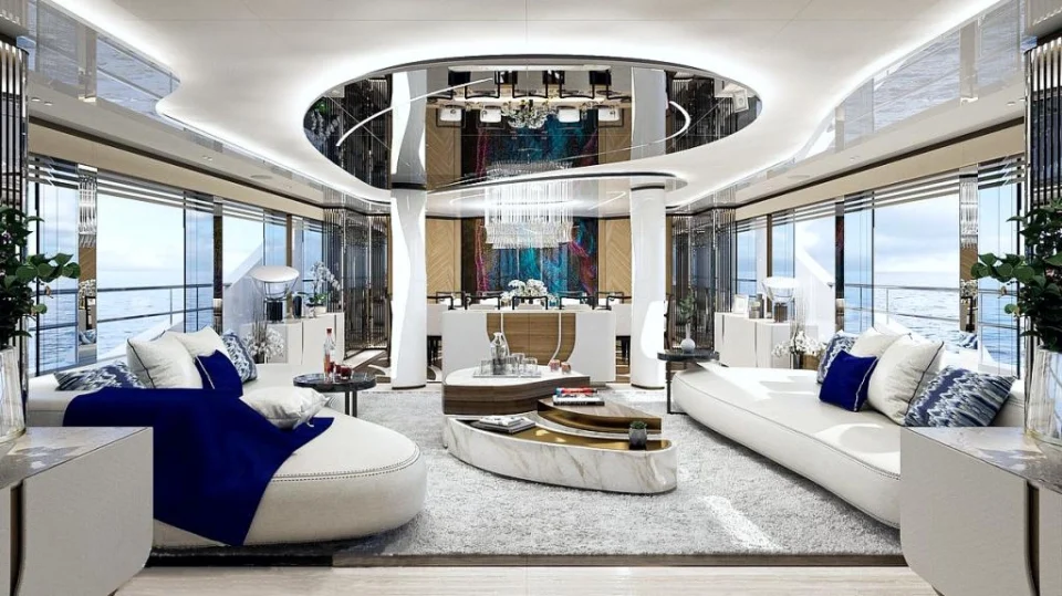 Ο Enrico Lumini παρομοιάζει τη φρέσκια και ηλιόλουστη ατμόσφαιρα του γιοτ, με εκείνη μιας βίλας στην Κυανή Ακτή. Η εσωτερική διακόσμηση εξασφαλίζει μια ζωντανή αλλά καλόγουστη ατμόσφαιρα, δημιουργώντας έναν φιλόξενο χώρο για τους επισκέπτες.
