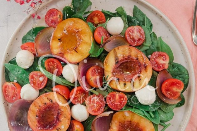 - Πλένω το σπανάκι και το στεγνώνω καλά. Ανακατεύω τα υλικά της βινεγκρέτ και ραντίζω το σπανάκι με τη μισή ποσότητα. Ανακατεύω καλά και το μεταφέρω σε πιατέλα. Στολίζω με τα ντοματίνια, τα μοτσαρελάκια, τα ψημένα ροδάκινα και τα κρεμμύδια. Ραντίζω με την υπόλοιπη βινεγκρέτ και σερβίρω αμέσως.