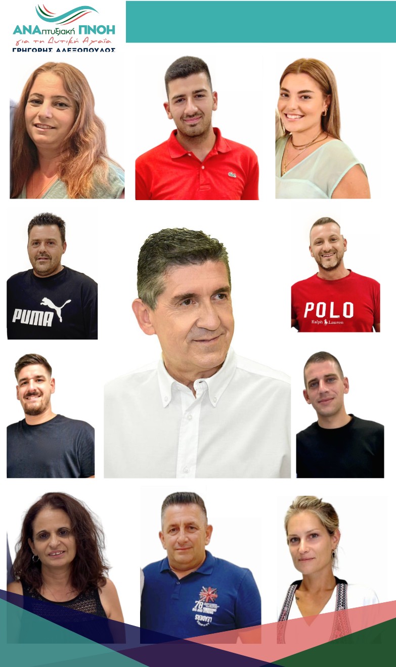 Στην τελική ευθεία των ανακοινώσεων προσώπων που θα βρίσκονται στα ψηφοδέλτια της παράταξης «ΑΝΑπτυξιακή ΠΝΟΗ για τη Δυτική Αχαΐα» στις προσεχείς εκλογές του Οκτωβρίου προχωρά ο υποψήφιος Δήμαρχος Γρηγόρης Αλεξόπουλος.