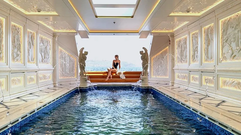 To νέο superyacht «Leona», μήκους 80 μέτρων, διαθέτει beach club εμπνευσμένο από την αρχαία Ελλάδα, εφάμιλλο ξενοδοχείου 5 αστέρων. Το πολυτελές σκάφος των πέντε καταστρωμάτων διαθέτει επίσης πισίνα υπερχείλισης, κινηματογράφο και sky lounge.