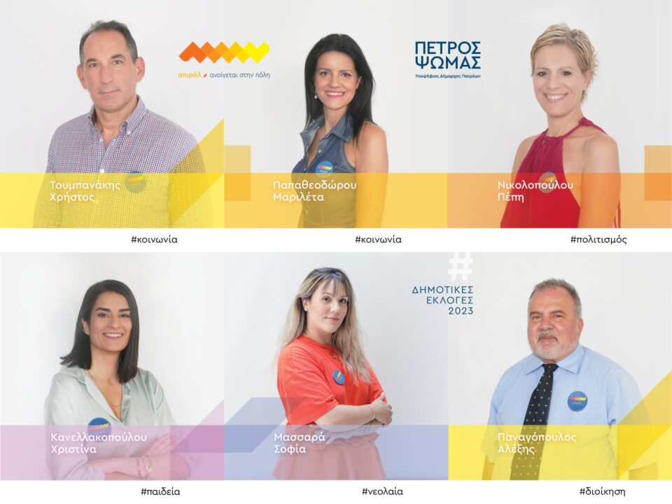 Τέσσερεις γυναίκες και δύο άνδρες, ενεργοί πολίτες, διαφόρων επαγγελματικών τάξεων, με αγάπη για τον τόπο τους, συστρατεύονται με το σπιράλ, αγκαλιάζοντας το όραμα του υποψήφιου Δημάρχου Πέτρου Ψωμά για αλλαγή στο Δήμο της Πάτρας.