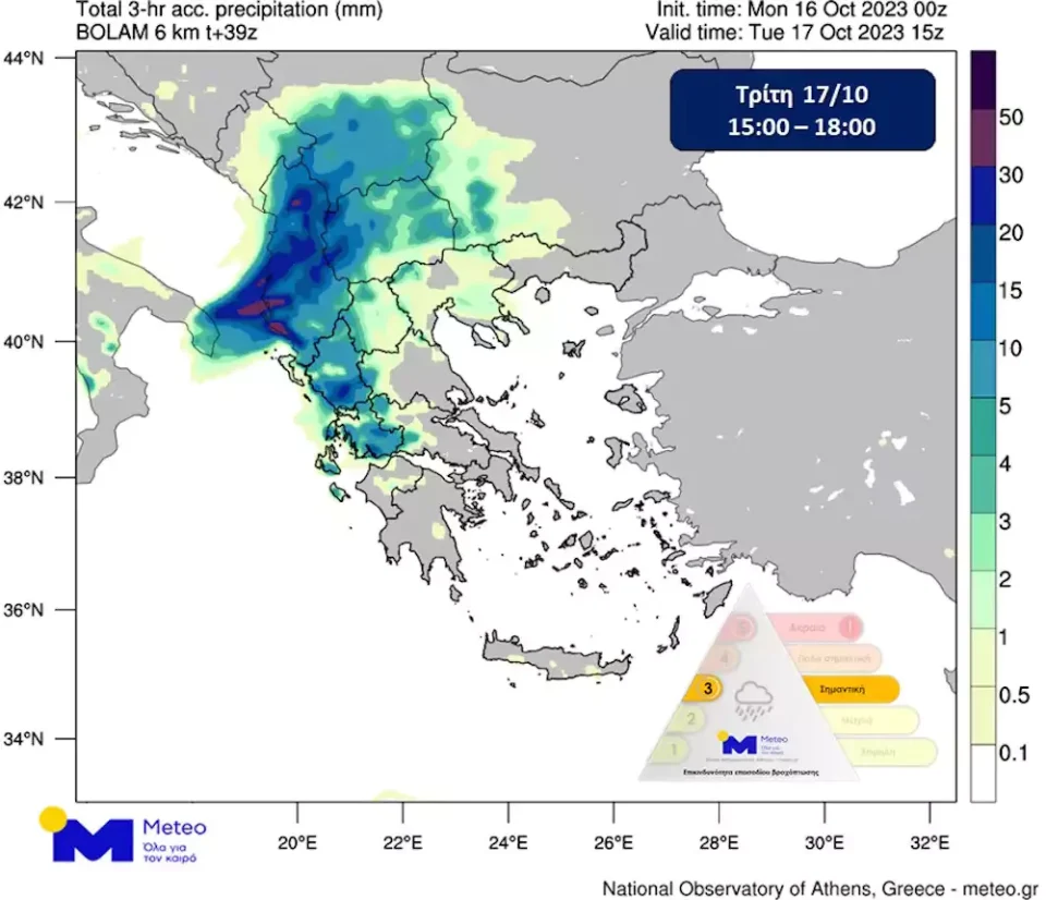 Βροχές κατηγορίας 3 (Σημαντικές) αναμένονται στη χώρα μας αύριο Τρίτη (17.10.2023) με τοπικά ισχυρές καταιγίδες, κυρίως στα δυτικά και στα βόρεια, σύμφωνα με την πρόγνωση του καιρού από το meteo του Εθνικού Αστεροσκοπείου Αθηνών.