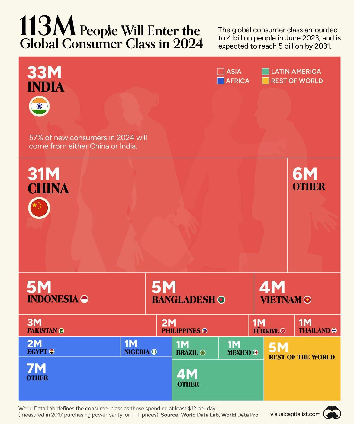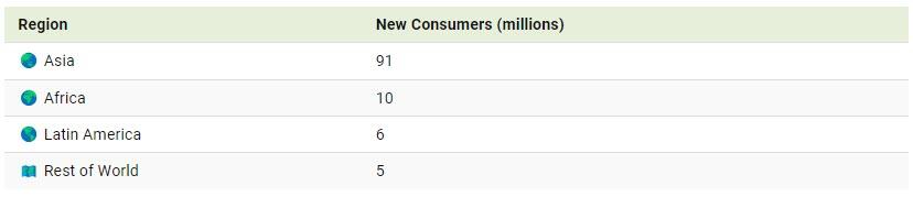Κάθε χρόνο, 100 εκατομμύρια άνθρωποι εισέρχονται στην παγκόσμια μεσαία τάξη. Σύμφωνα με το World Data Lab, η μεσαία τάξη συμπεριλαμβάνει άτομα τα οποία ξοδεύουν τουλάχιστον $12/ημερησίως, βάσει στοιχείων PPP – ισοδυναμίας αγοραστικής δύναμης του 2017. Το μεγαλύτερο μέρος των ανθρώπων αυτών προέρχονται από αναπτυσσόμενες οικονομίες της Ασίας και της Αφρικής.