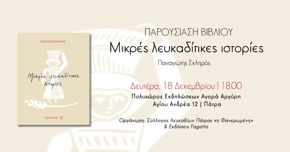 Ο Σύλλογος Λευκαδίων Πάτρας «Η ΦΑΝΕΡΩΜΕΝΗ» και ο εκδοτικός Οίκος Fagottο σας προσκαλούν στην παρουσίαση του βιβλίου Μικρές λευκαδίτικες ιστορίες του Παναγιώτη Σκληρού.