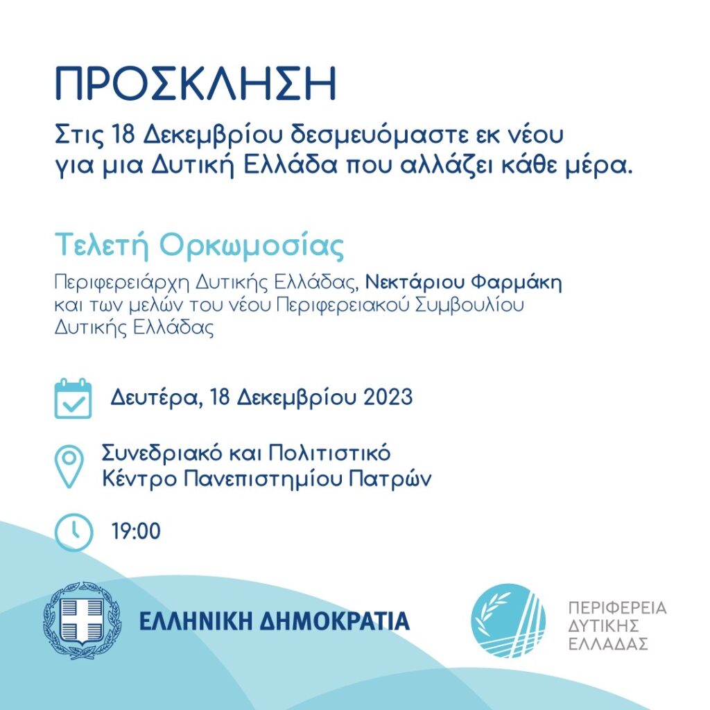 Την Δευτέρα 18 Δεκεμβρίου 2023, θα τελεστεί η ορκωμοσία του Περιφερειάρχη Δυτικής Ελλάδας Νεκτάριου Φαρμάκη και των περιφερειακών συμβούλων που εξελέγησαν στις περιφερειακές εκλογές της 8ης Οκτωβρίου.