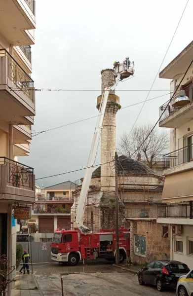 Με το ειδικό γερανοφόρο όχημα της Πυροσβεστικής το συνεργείο έφτασε στην κορυφή του μιναρέ για να αποκαταστήσει τη φωλιά από τις φθορές που υπέστη το χειμώνα.