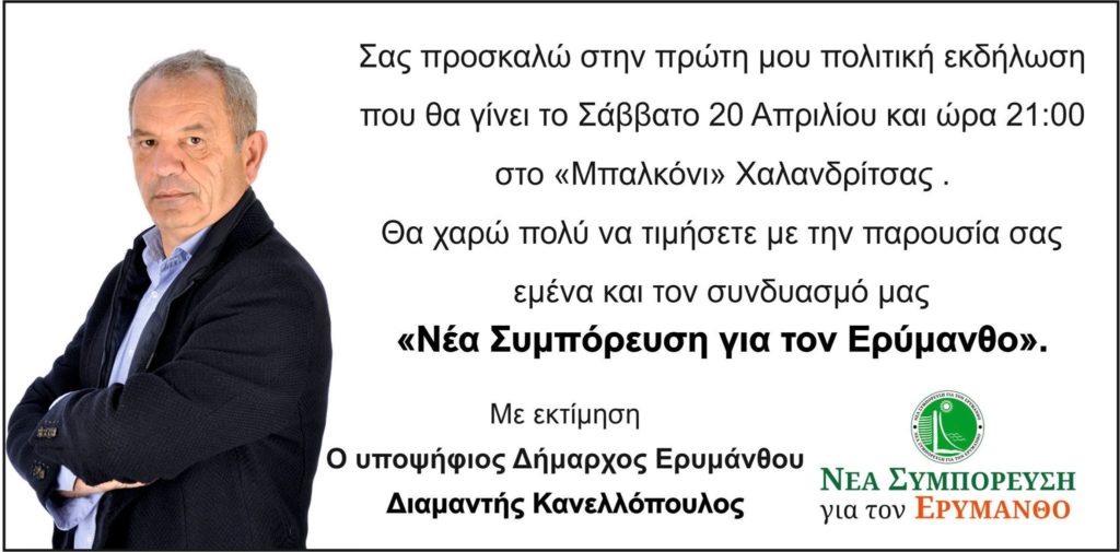 Tην πρώτη εκδήλωση με την οποία θα δοθεί και επίσημα η εκκίνηση του προεκλογικού αγώνα θα πραγματοποιήσει το Σάββατο 20 Απριλίου στις 21:00 στο «Μπαλκόνι» Χαλανδρίτσας ο συνδυασμός «Νέα Συμπόρευση για τον Ερύμανθο» με επικεφαλής και υποψήφιο Δήμαρχο Ερυμάνθου, τον Διαμαντή Κανελλόπουλο.