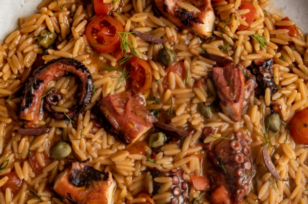 - Αφαιρούμε το χταπόδι από την κατσαρόλα και το κόβουμε σε μικρότερα κομμάτια. Δυναμώνουμε την ένταση της φωτιάς στο μέγιστο και προσθέτουμε το νερό. Μόλις το νερό έρθει σε βρασμό, προσθέτουμε το κριθαράκι, χαμηλώνουμε τη φωτιά στο μέτριο ώστε το φαγητό να σιγοβράζει και μαγειρεύουμε ανακατεύοντας μέχρι το κριθαράκι να μαλακώσει, για 15-20 λεπτά περίπου.