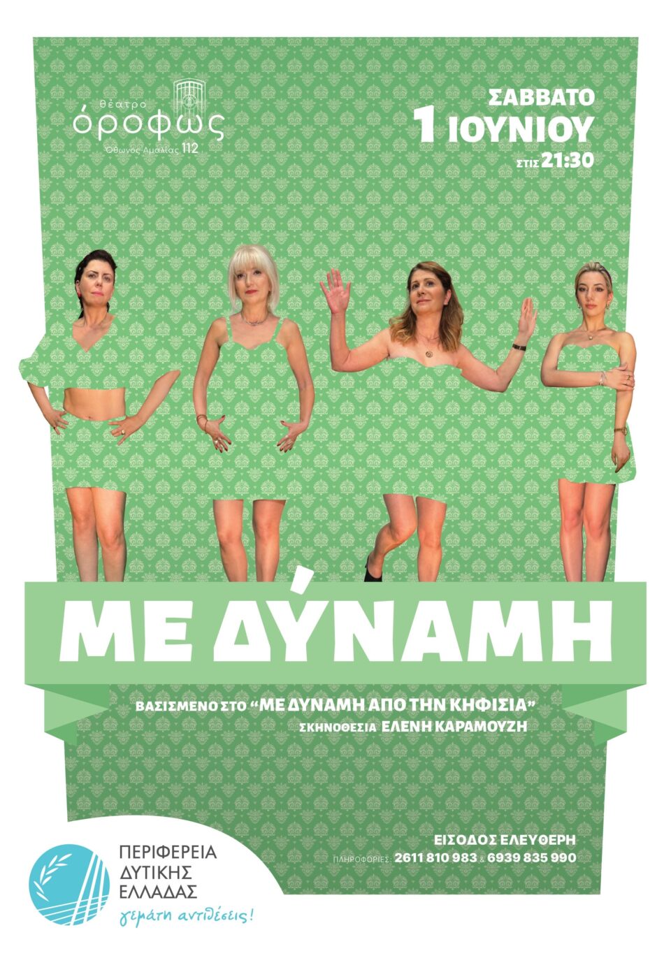 Η Περιφέρεια Δυτικής Ελλάδας συνδιοργανώνει με το Θέατρο όροφως (Όθωνος Αμαλίας 112) τη θεατρική παράσταση «Με δύναμη», το Σάββατο 1 Ιουνίου 2024 στις 21:30. Βασισμένο στο έργο σταθμό της σύγχρονης δραματουργίας, «Με δύναμη από την Κηφισιά», που έχει αφήσει το δικό του στίγμα, από το πρώτο του ανέβασμα στη “νέα Σκηνή” του Λευτέρη Βογιατζή κι έπειτα από μακρά διαδρομή, το έργο έρχεται στην Πάτρα μέσα από τη σκηνοθετική ματιά της Ελένης Καραμούζη. Η είσοδος για το κοινό θα είναι ελεύθερη, με προϋπόθεση κράτησης θέσεων στα τηλέφωνα: 2611 810 983 & 6939 835 990