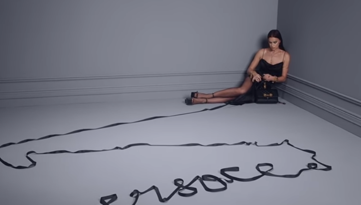 H Ιrina Shayk απολαμβάνει με όλες τις αισθήσεις την πολυτέλεια: μια μαύρη σατέν κορδέλα είναι η μοναδική λεπτομέρεια που υπάρχει μαζί της στο δωμάτιο.