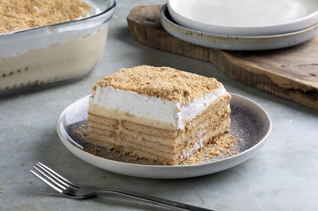 - Δημιουργούμε άλλη μια στρώση από μπισκότα βουτώντας τα ένα-ένα στο γάλα, και επαναλαμβάνουμε την διαδικασία μέχρι να έχουμε 3 στρώσεις από μπισκότα και 3 στρώσεις από κρέμα.