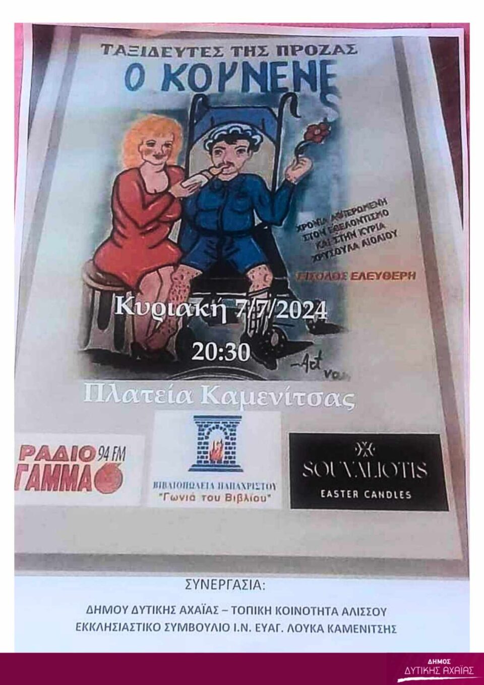 «Οι Ταξιδευτές της Πρόζας» έρχονται την Κυριακή το βράδυ στη Δυτική Αχαΐα με το επιτυχημένο έργο «Ο ΚΟΥΝΕΝΕ». Η παράσταση ανεβαίνει με συνδιοργάνωση Δήμου Δυτικής Αχαΐας, Τοπικής Κοινότητας Αλισσού και Εκκλησιαστικού Συμβουλίου Ι..Ν. Ευαγ. Λουκά Καμενίτσης. Η είσοδος για το κοινό είναι ελεύθερη. Ώρα έναρξης 8:30 το βράδυ στην Πλατεία Καμενίτσας.