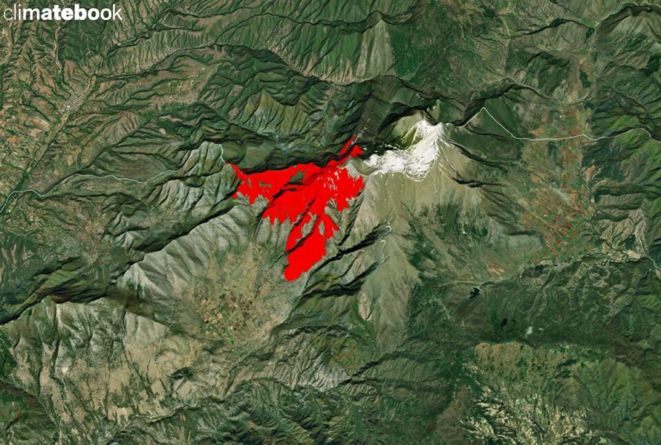 Εικόνα 1. Δορυφορική εικόνα της καμένης έκτασης από την πρόσφατη πυρκαγιά στό όρος Όρβηλος στα ελληνοβουλγαρικά σύνορα από τον ευρωπαϊκό δορυφόρο Sentinel-2 στις 03/08/2024.
