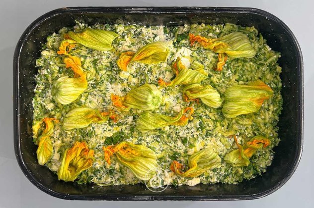 - Μπήγουμε τους ανθούς στην επιφάνεια και ραντίζουμε µε το υπόλοιπο ελαιόλαδο (επιμένουμε στους ανθούς με το λάδι γιατί καίγονται εύκολα).