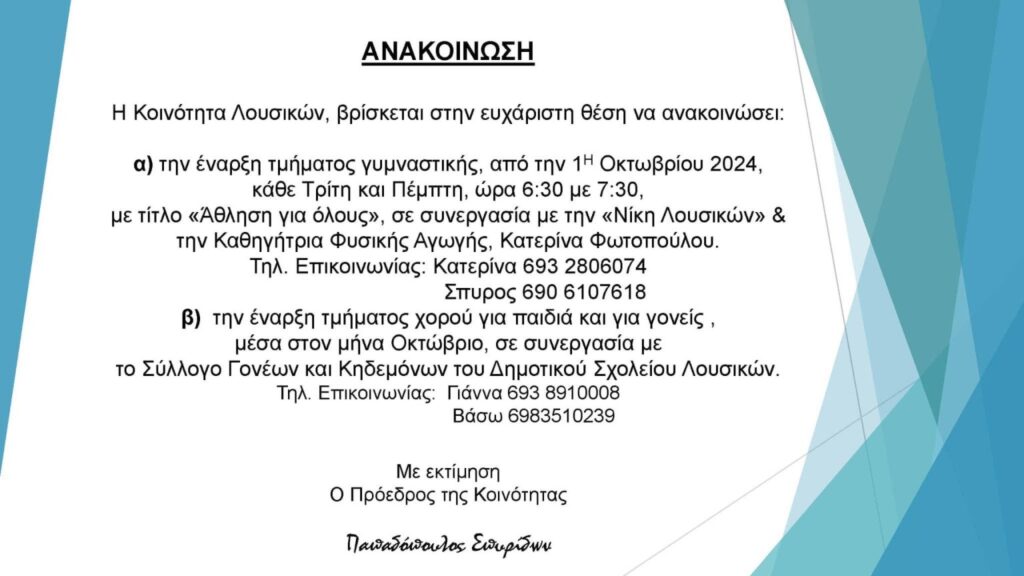 Τοπικές ΚοινότητεςΛουσικά: Ξεκινά τμήμα γυμναστικής και τμήμα χορού για παιδιά και γονείς by 4press18 Σεπτεμβρίου 202418 Σεπτεμβρίου 2024 Share0