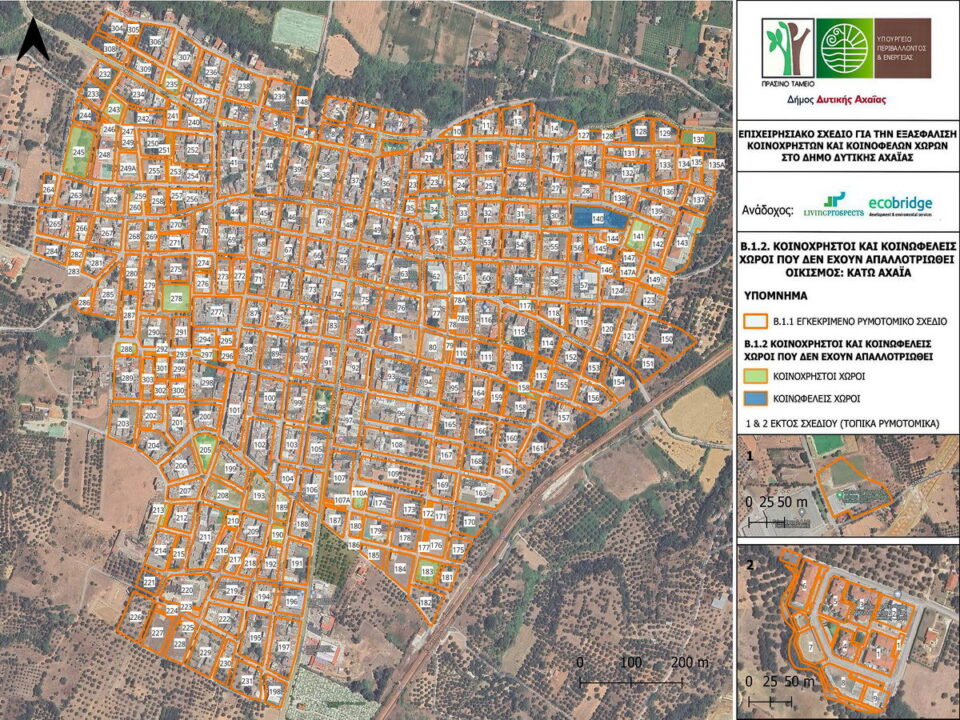 Για τους οικισμούς Απιδεώνα, Λάππα και Άνω Μαζαράκι, δεν εντοπίστηκαν τελικά ΚΧ και ΚΦ χώροι για τους οποίους συντρέχουν λόγοι απαλλοτρίωσης. Για τον οικισμό της Κάτω Αχαΐας εντοπίστηκαν είκοσι (20) ΚΧ και ΚΦ χώροι, οι οποίοι αξιολογήθηκαν βάση της αναγκαιότητας τους για τον ευρύτερο πολεοδομικό σχεδιασμό και ιεραρχήθηκαν για τη συμμετοχή τους στις δράσεις του ΕΣΕΚΚ του Δήμου για την ολοκλήρωση της απαλλοτρίωσης τους.
