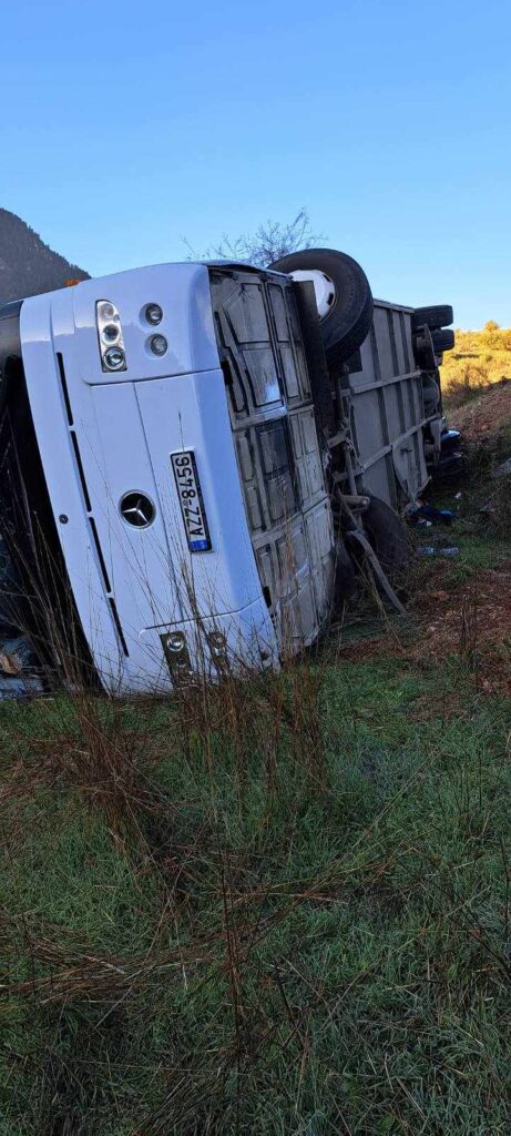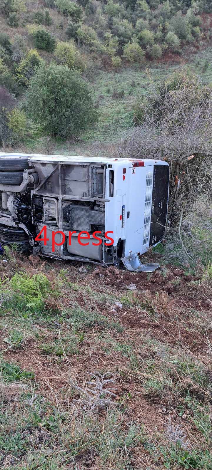 Το λεωφορείο εξετράπη της πορείας του στο ύψος της Ροδέας και ανετράπη.