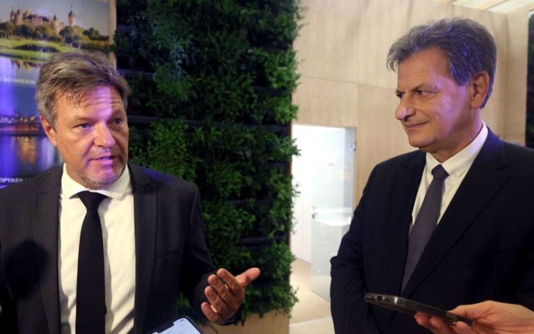 Τη δυνατότητα διασύνδεσης των ενεργειακών συστημάτων των δύο χωρών εξέτασαν στη συνάντησή τους στο περιθώριο της 88ης ΔΕΘ, ο υπουργός Περιβάλλοντος και Ενέργειας, Θεόδωρος Σκυλακάκης με τον Γερμανό αντικαγκελάριο, υπουργό Οικονομικών Υποθέσεων και Κλιματικής Προστασίας, Ρόμπερτ Χάμπεκ.