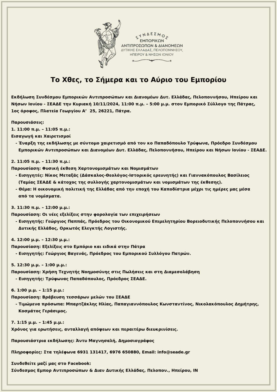Εκδήλωση Συνδέσμου Εμπορικών Αντιπροσώπων και Διανομέων Δυτ. Ελλάδας, Πελοποννήσου, Ηπείρου και Νήσων Ιονίου – ΣΕΑΔΕ την Κυριακή 10/11/2024, 11:00 π.μ. – 5:00 μ.μ. στον Εμπορικό Σύλλογο της Πάτρας, 1ος όροφος, Πλατεία Γεωργίου Α’ 25, 26221, Πάτρα.