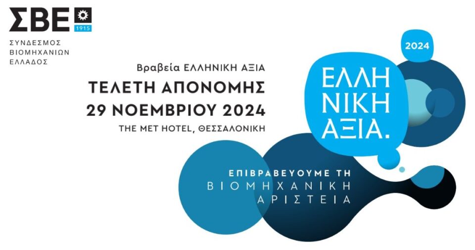Η ένατη τελετή απονομής των Βραβείων «ΕΛΛΗΝΙΚΗ ΑΞΙΑ», από τον Σύνδεσμο Βιομηχανιών Ελλάδος, θα πραγματοποιηθεί την Παρασκευή 29 Νοεμβρίου, στο ξενοδοχείο The Met της Θεσσαλονίκης. Στη φετινή διοργάνωση έχει προσκληθεί και θα χαιρετίσει ο Υπουργός Υποδομών και Μεταφορών Χρήστος Σταϊκούρας, ενώ την εκδήλωση θα τιμήσουν επίσης με την παρουσία τους κυβερνητικοί και αυτοδιοικητικοί αξιωματούχοι, όπως και εκπρόσωποι παραγωγικών φορέων.