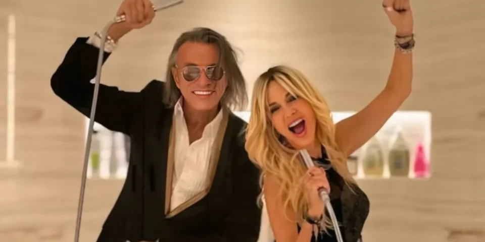 Στην εν λόγω φωτογραφία, Ηλίας Ψινάκης και Άννα Βίσση καταγράφονται στο μπάνιο του σπιτιού του μάνατζερ, να έχουν μετατρέψει τα τηλέφωνα του ντους σε… μικρόφωνα, και να τραγουδούν ο ένας πλάι στον άλλο.