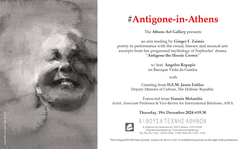 Μια ακόμα παρουσίαση του βιβλίου ”Antigone the Heroic Crown” από την Ginger Zaimis στην Athens Art Gallery . Συμμετέχει ο καθηγητής της σχολής καλών τεχνών Yiannis Melanitis και ο υφυπουργός πολιτισμού Ιάσων Φωτήλας, Την εκδήλωση ντύνει με τις μελωδίες του ο Άγγελος Ρεπάπης βιόλα.