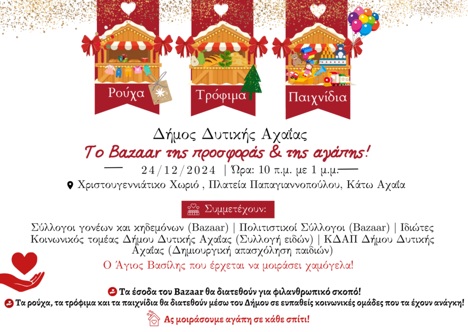 Το Χριστουγεννιάτικο χωριό του Δήμου Δυτικής Αχαΐας θα γεμίσει με χαρούμενα παιδικά πρόσωπα, παιχνίδια, τρόφιμα και ρούχα εν όψει των Χριστουγέννων. Συγκεκριμένα, την Τρίτη 24 Δεκεμβρίου 2024 από τις 10 το πρωί μέχρι και τη 1 το μεσημέρι στην πλατεία Παπαγιαννοπούλου, στην Κάτω Αχαΐα ο Δήμος διοργανώνει δράσεις αγάπης και προσφοράς:
