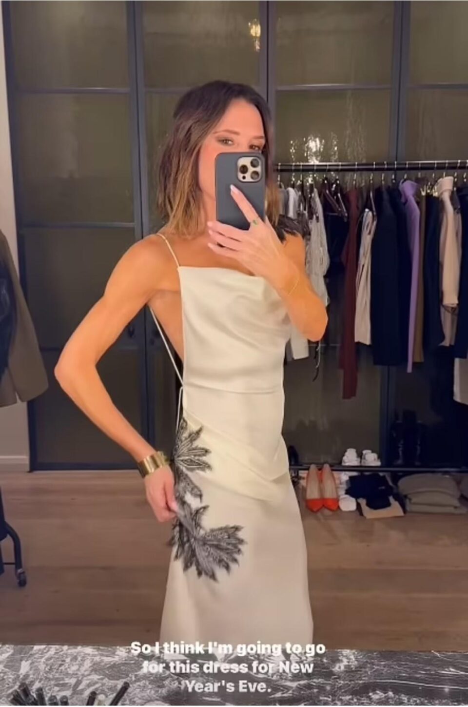 Το φόρεμα είχε ανοιχτή πλάτη και ιδιαίτερα διακοσμητικά στοιχεία, όπως το πίσω κέντημα και οι πούλιες. Το στιγμιότυπο αυτό έρχεται μετά από μια οικογενειακή φωτογραφία που ανέβασε με τον σύζυγό της, Ντέιβιντ, και τα τέσσερα παιδιά τους, καταδεικνύοντας μια ευτυχισμένη και ενωμένη οικογενειακή στιγμή. Η Βικτόρια Μπέκαμ μοιράστηκε τον ενθουσιασμό της και αποκάλυψε ότι αυτό το κομμάτι μπορεί να είναι η επιλογή της για την Πρωτοχρονιά.
