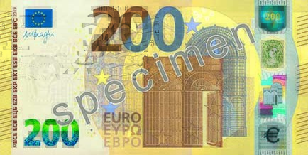 Στα νέα χαρτονομίσματα των 100 ευρώ επικρατεί κυρίως το πράσινο χρώμα, ενώ σε εκείνα των 200 ευρώ θα κυριαρχούν αποχρώσεις του κίτρινου και του καφέ. Σε όλα, όμως, υπάρχει αναφορά στην ελληνική μυθολογία, καθώς όταν τα κοιτάζει κανείς στο φως διαγράφεται και στις δύο πλευρές το πορτρέτο της μυθολογικής Ευρώπης.