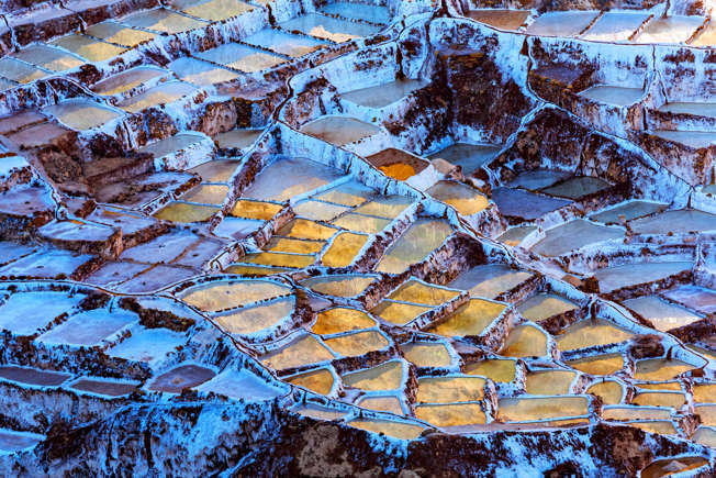 Ακριβώς έξω από το χωριό Μάρας στο Περού, βρίσκεται αυτός ο λόφος με τις αλυκές, των οποίων το πλήθος μαρτυρά τη ζωτική σημασία που έχει το αλάτι για την τοπική οικονομία. Ένα υπόγειο ρεύμα νερού αναβλύζει μέσα από τη γη και στη συνέχεια εξατμίζεται, αφήνοντας πίσω κρυστάλλους αλατιού. Το Μάρας βρίσκεται σε ένα πολιτιστικό και ιστορικό κέντρο, γνωστό ως Ιερή Κοιλάδα των Ίνκας, ενώ βορειότερα και ψηλότερα στα βουνά βρίσκονται τα ερείπια του Μάτσου Πίτσου. Εδώ, στο Σαλίνας ντε Μάρας, οι ντόπιοι συλλέγουν το αλάτι για αιώνες και το αξιοποιούν συνεταιρικά: καθένας μπορεί να πάρει αλάτι, αρκεί να συμφωνήσει να τηρεί τους κανόνες της κοινότητας.