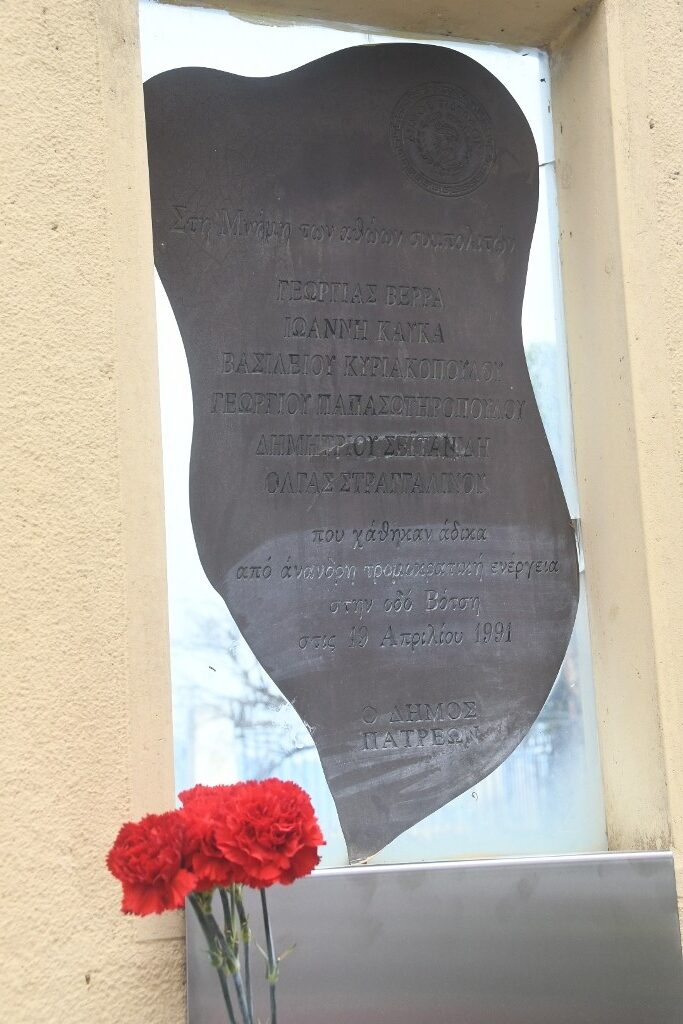 Ξύπνησαν μνήμες σήμερα το πρωί, κατά την διάρκεια τέλεσης του ετήσιου μνημόσυνου για τους έξι Πατρινούς που βρήκαν πριν από 34 χρόνια, στις 19 Απριλίου του 1991, τραγικό θάνατο από τη φονική έκρηξη βόμβας στην οδό Βότση: Τον Γιώργο Παπασωτηρόπουλο 58 χρόνων, τον Βασίλη Κυριακόπουλο 53, τον Γιάννη Καυκά 25, την Όλγα Στραγγαλινού 25, τον Δημήτρη Σεϊτανίδη 23 και την Γεωργία Βέρρα 24 χρόνων.