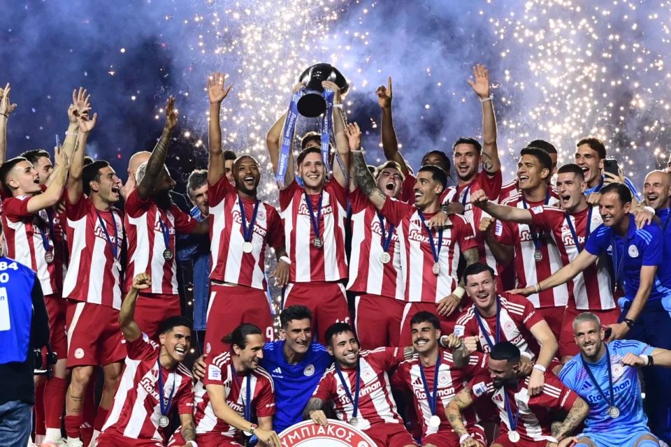 Ο Ολυμπιακός «γιορτάζει». Οι «ερυθρόλευκοι» είχαν εξασφαλίσει και μαθηματικά τον τίτλο του πρωταθλήματος, ωστόσο, ήρθε η ώρα να κάνουν και τη φιέστα.