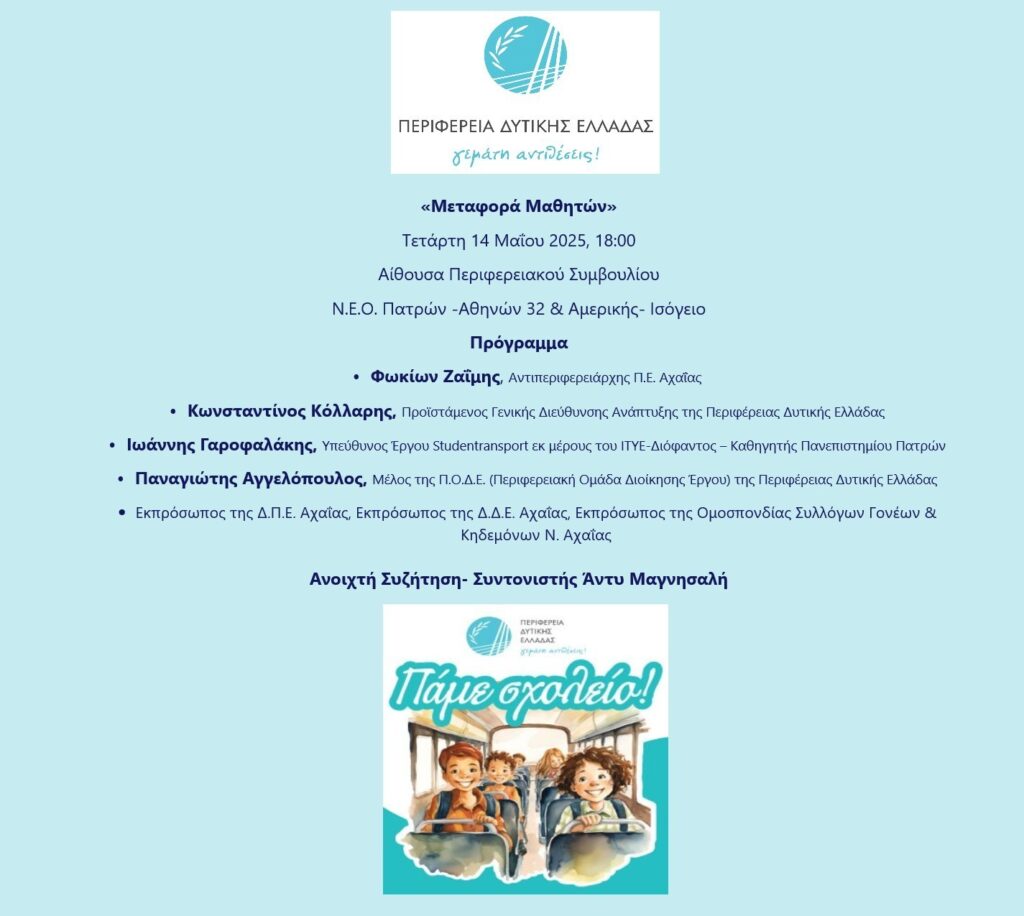 Με κεντρικό σύνθημα «Πάμε Σχολείο», θα πραγματοποιηθεί ενημερωτική συνάντηση με θέμα τη «Μεταφορά μαθητών», την Τετάρτη 14 Μαΐου 2025 και ώρα 18:00 στην αίθουσα του Περιφερειακού Συμβουλίου Δυτικής Ελλάδος. Ο Αντιπεριφερειάρχης Π.Ε. Αχαΐας, Φωκίων Ζαΐμης απευθύνει ανοικτό κάλεσμα σε εκπαιδευτικούς, επαγγελματίες οδηγούς, γονείς και πολίτες που ενδιαφέρονται για το θέμα να συμμετέχουν.